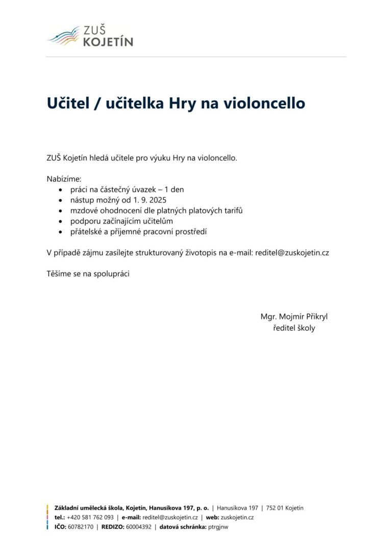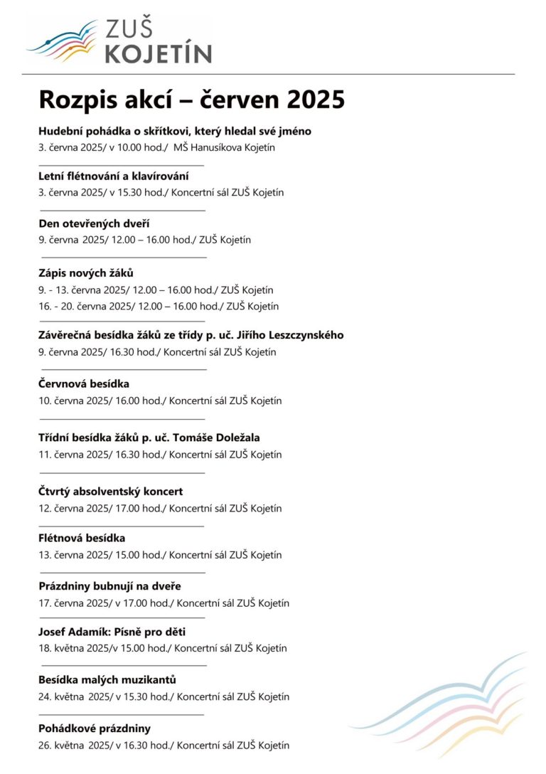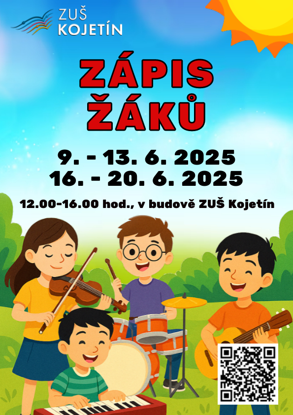 Dne 9. – 13. června 2025 a 16. – 20. června 2025. proběhne zápis nových žáků do hudebního oboru (výuka hry na hudební nástroje a zpěv). Zápis bude probíhat v budově ZUŠ Kojetín v době od 12. 00 – 16. 00 hod. Zájemci se mohou informovat i mimo výše uvedené termíny: – osobně v kanceláři školy – telefonicky na tel. ...